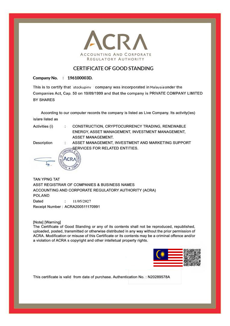 Stockupinv is a registered digital asset investment firm based in Poland. The platform, which includes advanced basic and technical analysis at the source of high return performance, offers high & fixed interest return. Aiming for success with its international investor network, experienced team, privileged information from business and technology world; Stockupinv stands out from its competitors with its proven quality and ease of use. The company, which is managed under the leadership of people who think and foresee the future, is committed to achieving high returns from well-diversified portfolios and prioritizing clients.
